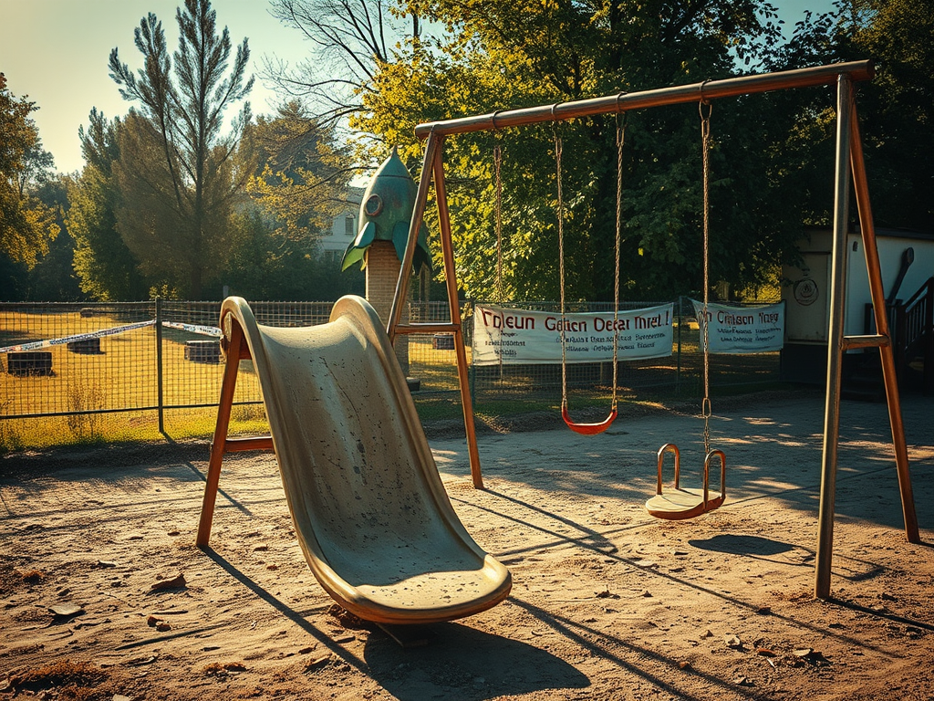 A dusty slide and swings, a rocket-shaped