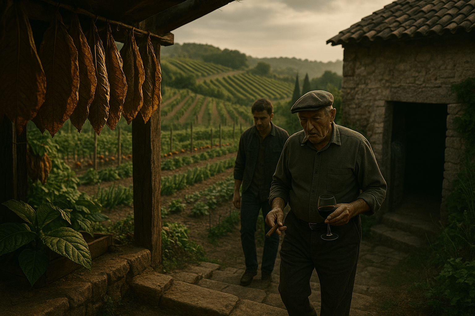 peppers, garlics, tomatoes, onions, grapevines.